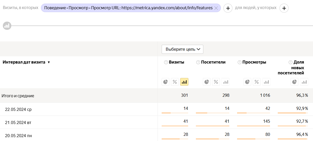 Например, группа условий Просмотры, в которых. В отчете останутся данные о визитах, которые содержат просмотры с заданным условием.