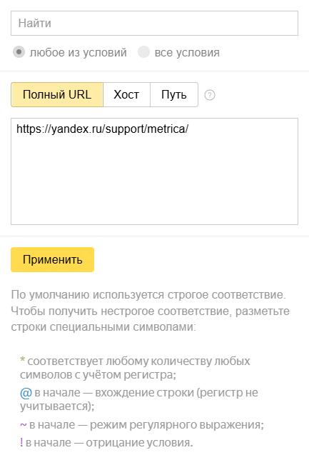 Например, условия, связанные с указанием URL, заголовка страницы или поисковой фразы. Такие условия можно задать в поле для ввода. При указании нескольких условий, каждое условие должно начинаться с новой строки.