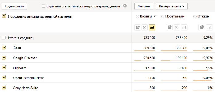 Отчет содержит информацию о переходах посетителей на ваш сайт из рекомендательных систем (ленты новостей, тематических статей и т. д.).
