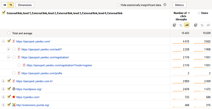 Bağlantıya tıklandığında başka bir adrese yönlendirme yapılsa Yandex Metrica o yönlendirmenin hedef sayfa adresini hesaplamaz ve o adres rapora girmez.