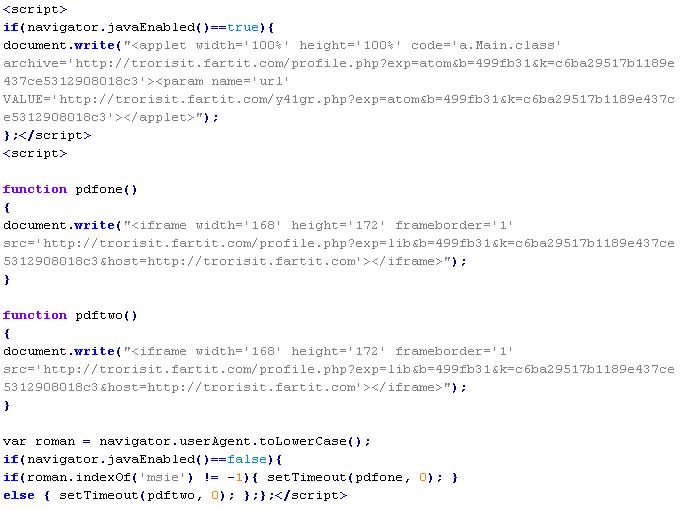 Example of malicious code that is issued the verdict Yandex/MalTds: