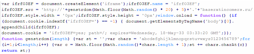 Bu karar, sayfanın kötü amaçlı yazılım dağıtan bir sunucunun alan adını belirten script etiketi ile src özelliği içerdiği anlamına gelir. Yüklenen betik genellikle görünür sayfa alanının dışında yerleştirilen <iframe> etiketini ekler.