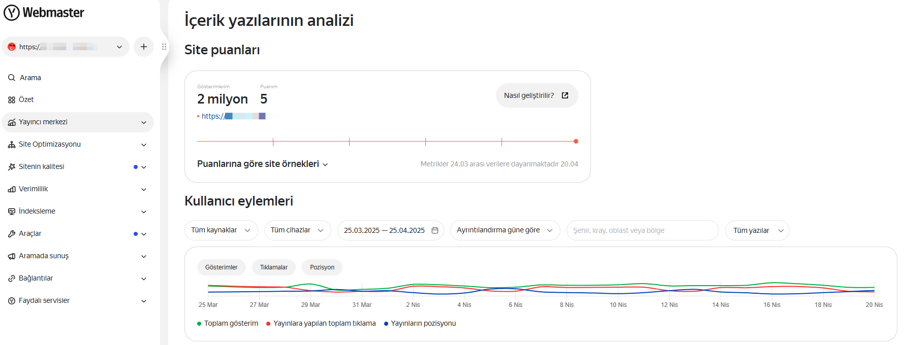 Yandex Webmaster’da içerik analizi haber siteleri sahiplerine şu özellikleri sunar: