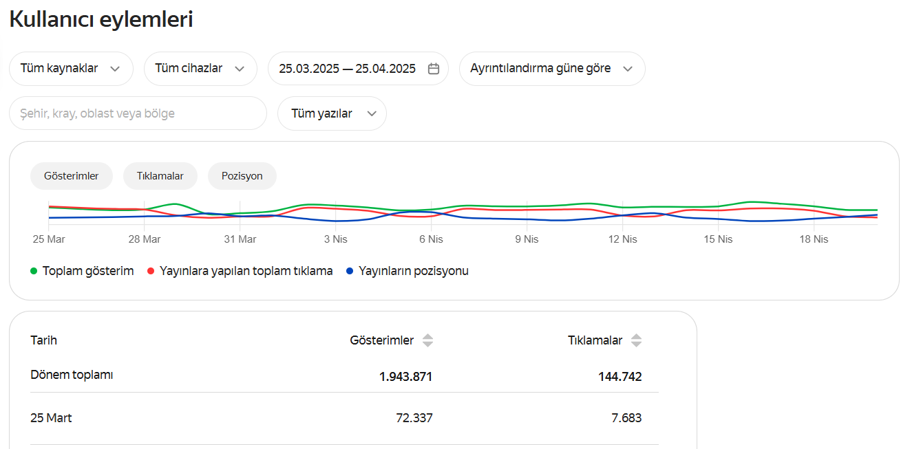 Yandex Arama sonuçlarında sitenize bağlantı içeren bir snippet’in numarası. Belirli bir anahtar kelime için sitenizin sıralaması gün boyunca değişebilir, bu nedenle servis günlük ortalama pozisyonu gösterir.