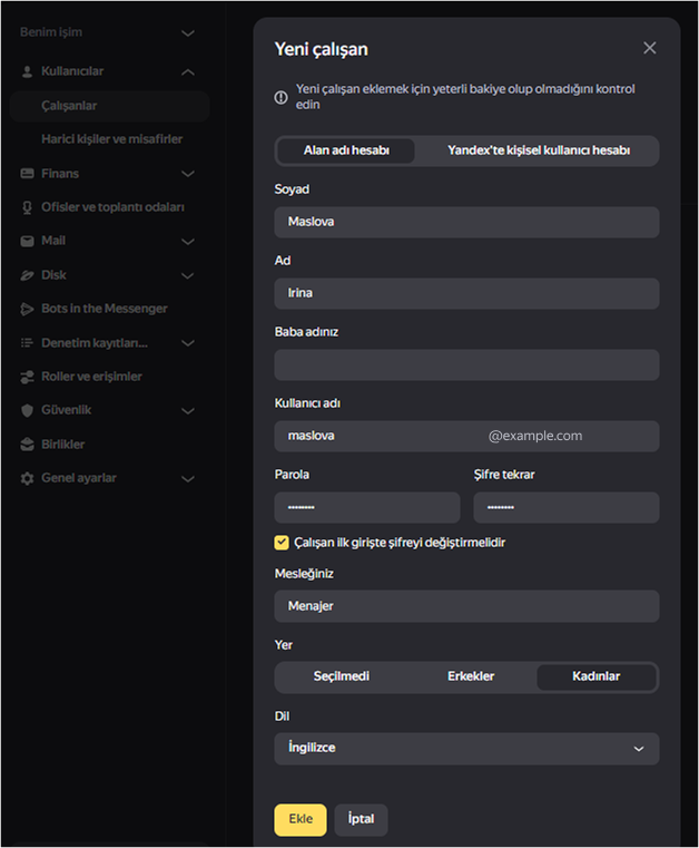 Şirket çalışanlarınızın Kurumlar için Yandex 360 servislerini kullanabilmeleri için kurumunuzdaki çalışanlarınız için kullanıcı hesapları oluşturun.