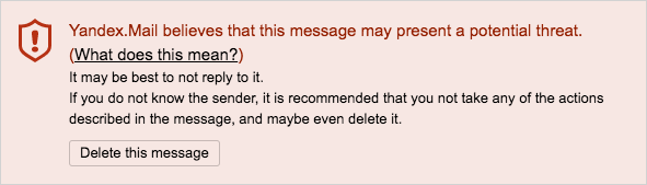 Yandex Mail'in phishing amaçlı olarak saptadığı tüm e-postalar, servis tarafından şöyle bir uyarı mesajıyla işaretlenir:
