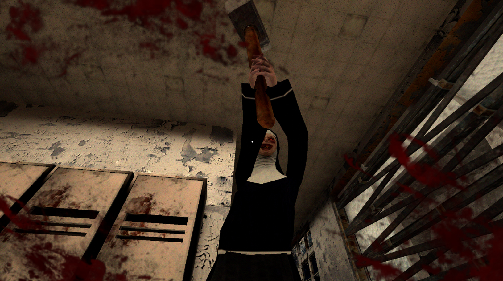 Görselde bol bol gerçekçi bir şekilde tasvir edilmiş kan var. Yaralama işlemi gösterilmiyor fakat rahibenin elindeki silah, olup bitenleri kanıtlıyor. |