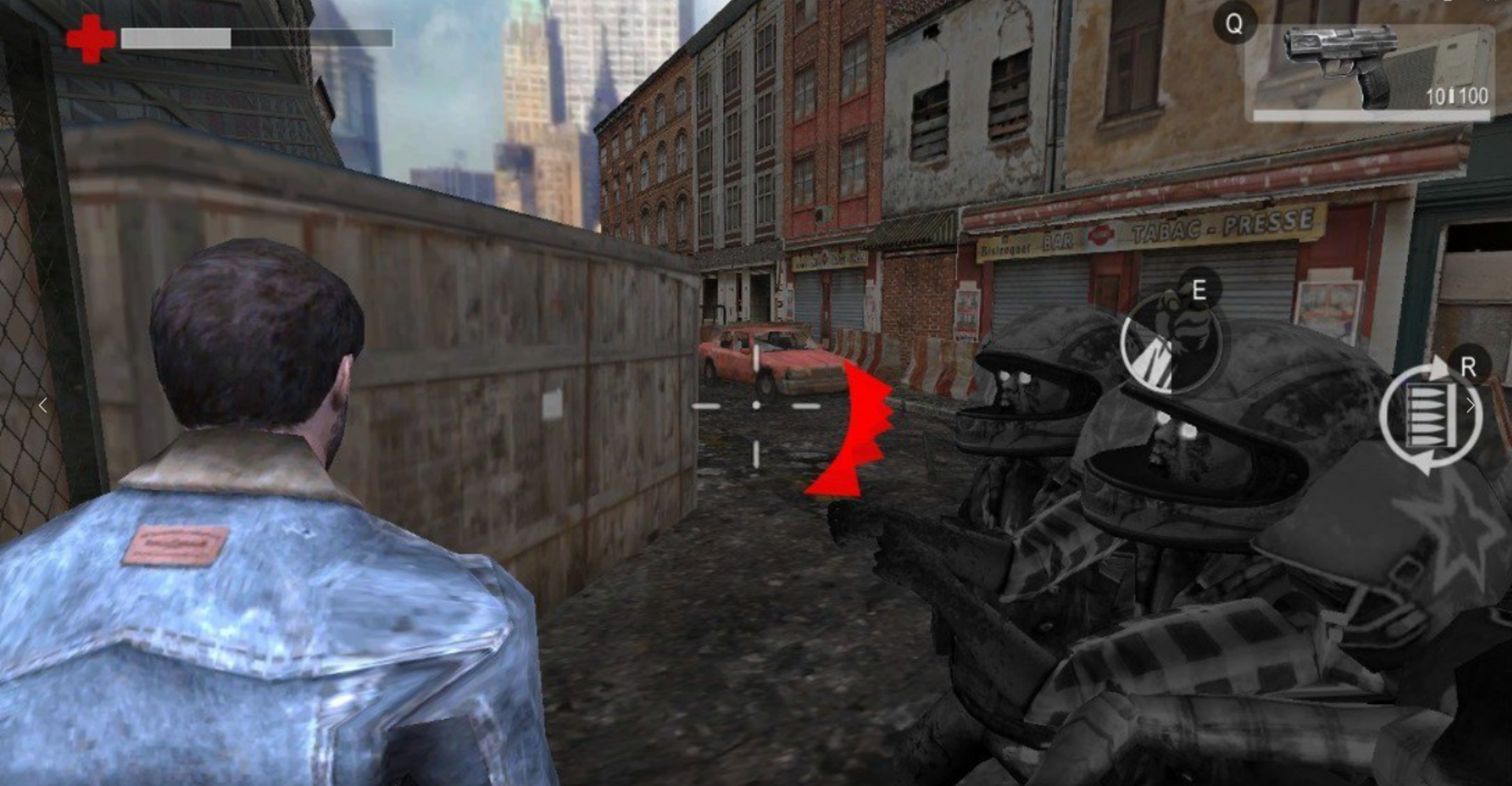 Zombiler, ufuktaki siluetler şeklinde gösterilmiştir. Ana karakterin omzunun arkasında duran zombi solgun ve bulanık gösterildiği için pek göze çarpmıyor. Canavarlar odakta değildir. |