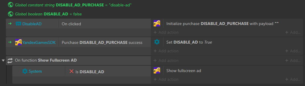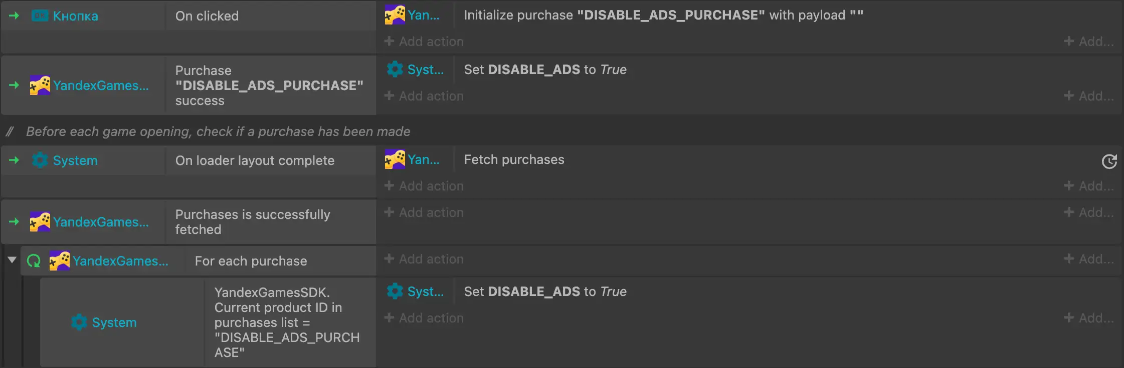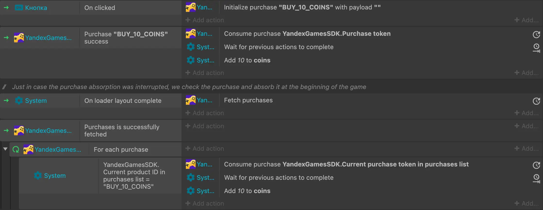 - Yandex Oyunları Geliştirici Konsolunda uygulama içi satın alımları bağlayın.
