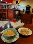 Подольский пивной ресторан Пив Бум и его бизнес ланч Продолжая рубрику делового обеда в Подольске решил посетить это заведение, ведь по прямому его назначению, а именно как питейное место я не попаду, так как элементарно не пью пиво вообще. Самым первым вас встретит максимально брутальный интерьер с очень приглушенным светом и без привычных атрибутов пабов, только подвешенные тв с телеканалом Матч, да деревянная мебель повидавшая многое на своём веку. Убедившись у официанта о наличии ланча получил лист формата А4 с небольшим и как я понял постоянным меню, которое скорее всего меняется раз в какой-либо промежуток времени. Выбор сделан в пользу всех позиций, а именно суп, горячее, салат и напиток за который здесь необходимо заплатить 400 рублей. Да! Необходимо уточнить желаете ли вы хлеб - он подается бесплатно по желанию. Подача была довольно быстрой и вежливой, ну а значит пора пробовать и ответить на главный вопрос - вкусно или нет? Первым приносят салат из фунчозы, но он откладывается на привычный для меня формат вместе с горячим и сначала традиционно суп, а именно гороховый с курочкой. Сразу прямое попадание в рецепторы - очень наваристо и необыкновенно вкусно с учетом того, что в этом году ем его впервые эффект был усилен наверно стократно!!! Горячее чахохбили также заслуживает высокую оценку, хотя конечно это не чахохбили, а очень нежно приготовленная курочка со специями похожими в составе с вышеупомянутым блюдом. А вот салатик мне вообще не зашёл, хотя я очень люблю фунчозу - но это не говорит, о его некачественности, а именно все ингредиенты свежие, просто мне не по душе его консистенция, кому-то наверно нравится так... P.S. Хороший, достойный внимания вариант бизнес ланча за щадящие ваш кошелёк цены, где хоть и разочаровала одна позиция, я всё-таки ставлю пять с небольшим минусом, ведь самую главную функцию здесь выполнили - накормили сытно, быстро и недорого!