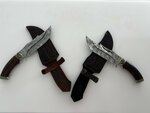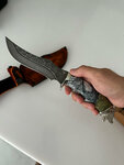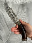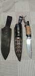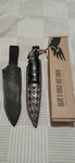 Мы сами куём дамаск в нашей кузнице. Материал рукояти: Больстер мельхиор, вставка зуб мамонта, айронвуд, темлячный пин