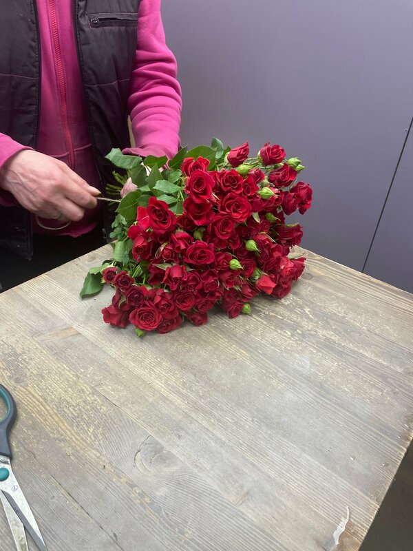 Вышло, что кустовых роз было немного, а запрос был именно на них. Те что были, были довольно помятыми, как мы с продавщицей поедположили еще при доставке. Выюради наиболее свежие веточки и упаковали для дороги в крафт и веревочкой. Учли все пожелания, поговорили о цветах. Все адекватно, разумно и относстельно вежливо. Хотя цены на бумагу обычно нет:)