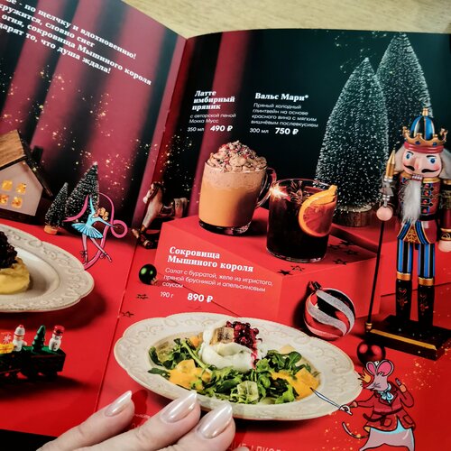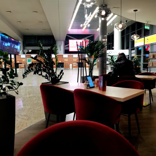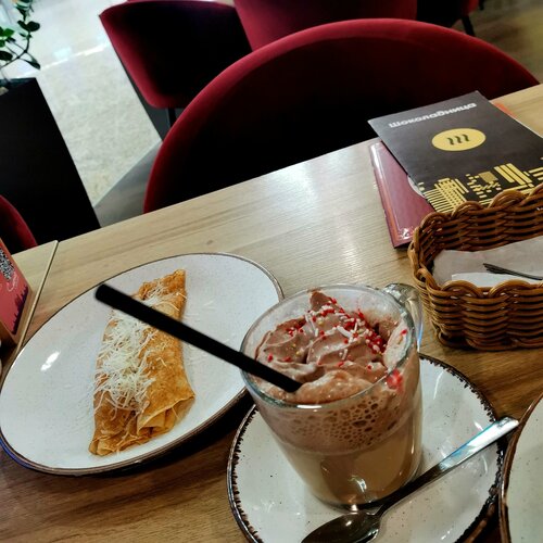 Если бизнес-залом вы не пользуетесь, но хочется спокойно и приятно провести какое-то время до полета, а главное — вкусно и за вменяемые деньги поесть, то идите в "Шоколадницу". Искать ее в аэропорту Шереметьево теперь стоит в терминале D в районе стоек 90-99, в самом конце, в противоположной стороне от выходов на посадку и по пути к аэроэкспрессу. Место ещё более уютное, чем до этого (посадка, интерьер, оформление). Цены и вкус по сравнению со всем, что располагается в зале ожидания, — самые лучшие. Когда наконец выяснила, куда её перенесли, стала приезжать пораньше, чтобы перекусить перед вылетом (особенно с учётом того, что многие рейсы сейчас задерживаются). Давиться абы чем и соглашаться на не пойми какой сервис с пластиковыми вилками и ложками, а ценой, как в неплохом ресторане в центре, не очень хочется. Порции стали гораздо меньше, но от того не менее вкусными. В блинчиках с ветчиной и сыром мало начинки, но много соуса (что, видимо, компенсирует калорийность), размер тоже раза в полтора меньше, чем раньше (если не в два). Но, в целом, если взять что-то ещё — наесться можно. Взяла ещё грибной крем-суп (чудесный, как всегда, несмотря на весьма скромную порцию). Было сытно, очень даже (сил дождаться рейса, даже с учётом некоторой задержки, хватит). Плюс сезонный напиток: может, мне кажется, но бокал латте по-моему тоже очень уменьшился, количество напитка точно, а, если учесть ещё сверху сливки, то раза в три, наверное, порция меньше привычной. Его можно было не брать, в принципе (при желании потом взять уже в зале ожидания — там вряд ли сверху украсят сливками, но приличный кофе можно найти). В остальном — просто великолепно. Приятная музыка фоном, мгновенное обслуживание (а не с подносом бегать, роняя все на свете). В общем, счастлива, что Шоколадница по-прежнему есть в этом аэропорту и сохраняет уровень обслуживания и качества еды, и, конечно же, атмосферу. Размер порций, которые раньше были очень внушительными, сейчас, увы, пострадал. Но, видимо, это позволило сохранить цены на том же уровне, что и последних пары лет. Не спорю, что, возможно, есть ещё какие-то заведения непосредственно в зале ожидания (визуально вроде ничего), но пока ничем не впечатлилась на столько, чтобы захотелось зайти. Давиться всухомятку залежавшейся на витрине пиццой, наггетсами, бургерами и т.п., лично мне абсолютно не хочется. Есть заведения и с домашней кухней, но там ценник растет не по дням, а по часам, такое впечатление, порции уменьшаются с каждым разом при этом, плюс самобслуживание, как в столовой. Я не против этого, без проблем, но при условии бюджетных цен и вкусной еды. А не когда непонятно, за что платишь. Фото, какие получились. Несмотря на очень раннее утро, посетители были, а их фотографировать, думаю, не совсем правильно.