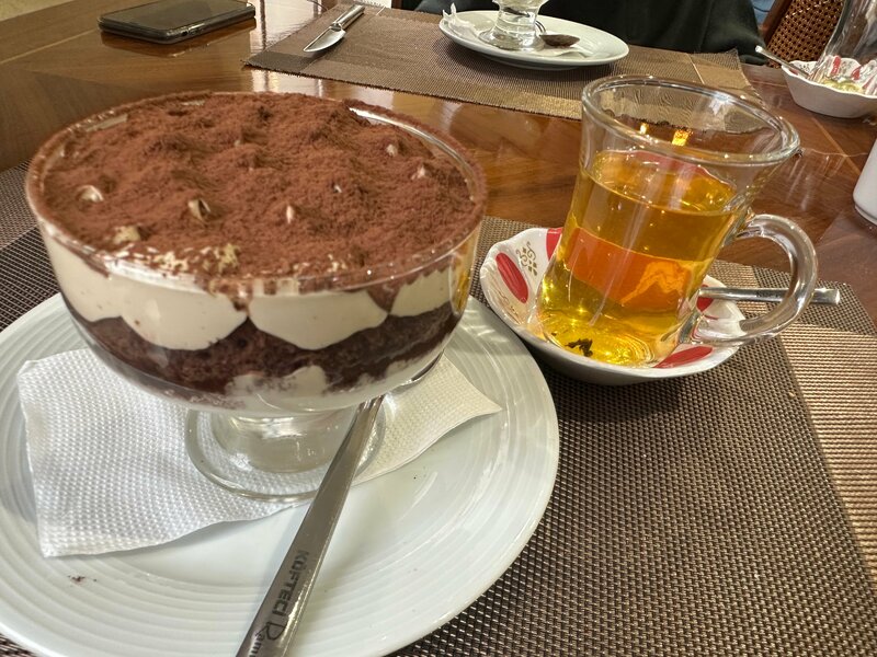 Два этажа, места много, но и народа много. Обслуживание быстрое и доброжелательное. По еде что-то вкусно, что-то не очень. Почти во все горячее добавляют лепешки как «подушки». Сами лепешки вкусные, но их реально много, отдельно хлеб брать не стоит. По мясу - всё было просто отлично, закуски - есть вопросики: суховато, жирновато… Тирамису огромный! Цены средние. В общем, в восторге мы не остались, но зайти пообедать можно.