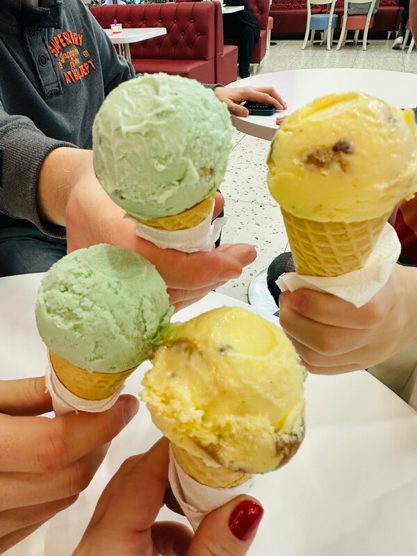 Хотя витрины полностью заставлены бочонками с мороженым, в наличии только два сорта: фисташковое и карамельное. Всё. На дворе Новогодние каникулы. Прям печальное зрелище.