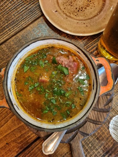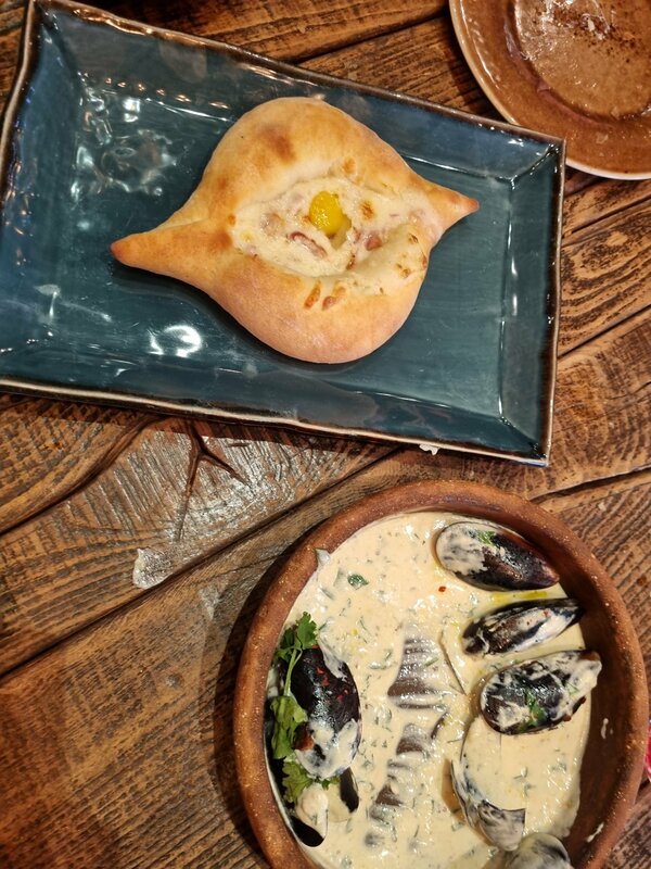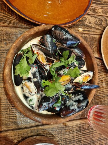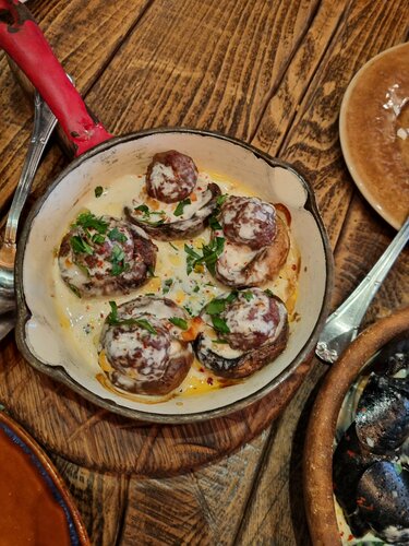 Замечательная атмосфера в ресторане , все блюда очень вкусные! Пробовали мидии -шмидии, хинкали, блюдо с шампиньонами и фаршем сверху, огромный воздушный чебурек, суп харчо и ещё небольшое хачапури. Мы были впервые, видимо поэтому нам, как туристам , устроили небольшое представление с тостами, музыкой , песней, с шапками папахой и угостили вином в роге, ) Если будете во Владивостоке, то обязательно посетите этот ресторан Супра рядом с Набережной. Но мест уже с утра очень мало , поэтому заранее нужно приходить , столики не бронируют ожидание по живой очереди. Мы пришли в 11 дня , и через час был полный ресторан уже )