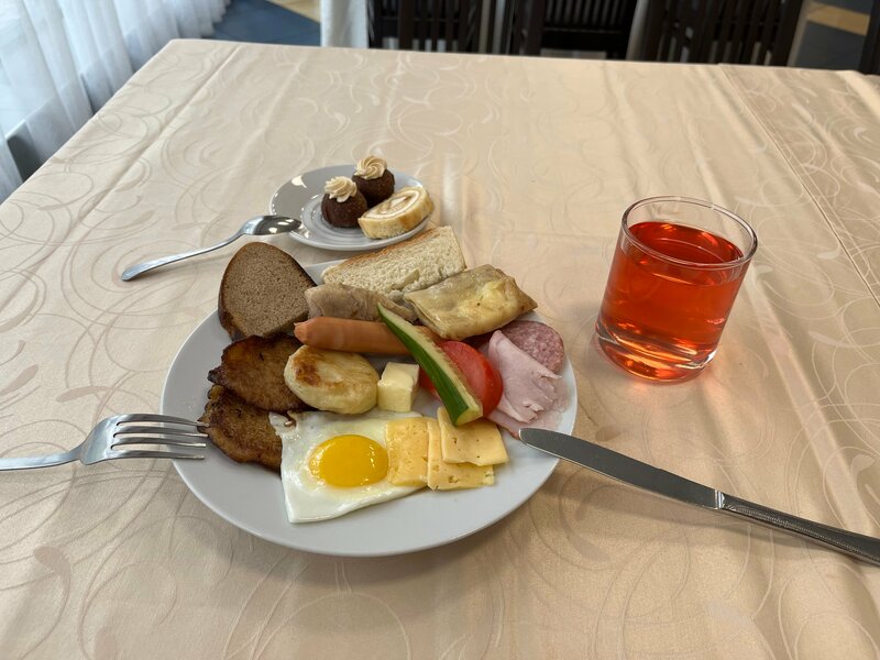 Давно я не останавливался в «советских» гостиницах - да и внешний вид как то отталкивал . старался снимать квартиры, а тут небыло вариантов -пятница день в день все занято в минске( … на мое удивление все очень понравилось. Быстрое заселение, все на высшем уровне. На этаже куллер, в номере есть чайник , холодильник ( правда слабо охлаждал) Номера с ремонтом, сантехника в идеальном состоянии.ЧИСТО! В общем остался доволен, соотношение цена качество на высоте-думаю даже теперь постоянно в ней останавливаться. Сантехника вся новая. Завтрак не включен был( 25 р шведский стол) на фото так скромненько выбрал что люблю наелся)) фото только из окна. P.S. на завтраках драники ну просто никакие)) смените повара🤣