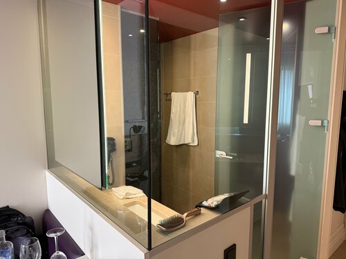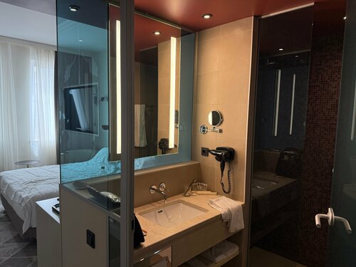 Отличное расположение в центре и на набережной. Фактически пешеходная зона. 4 этажа+подземная парковка(стоит 50 бел.руб в сутки). В номерах с окнами во внутренний двор тихо, шторы блевали. Завтрак отличный, но одна кофемашина. Ресторан со стандартными ценами. Есть веранда на набережной. Пиво на ней 150 руб, а вот Апероль-1000 рублей! Номер с чудными фантазиями дизайнера санузлов-из комнаты видно все, что там происходит через стекло и наоборот. Включенный ночью свет озаряет весь номер. Лучше этого отеля в Минске только ДипСервис(из тех где останавливался), но тут тусовка вокруг.