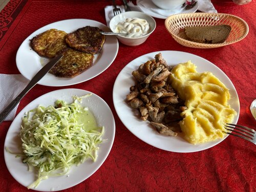Еда простая и сытная. Порции большие. Хозяин радушный. Обед на 2 чел с одним пивом-1000 рублей РФ
