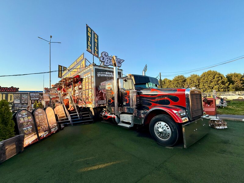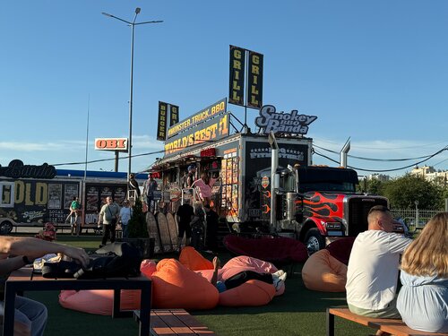 Очень интересное место! В меню много разнообразных бургеров, которые очень вкусные и сочные. Также есть ребра и картофель фри. На территории стоит большой американский трак и много грилей, где готовят еду. Обслуживание- довольно быстрое, хотя было очень много людей. Большая открытая территория, где можно посидеть и отдохнуть. Есть сцена, на которой бывают концерты. Место здоровское, хочется вернуться! Советую сюда хоть раз заглянуть!