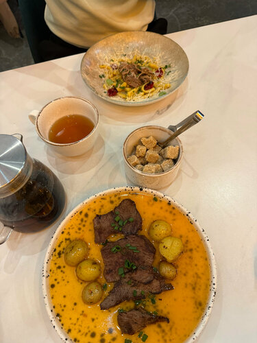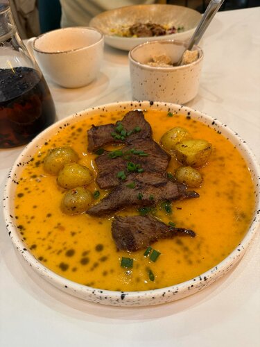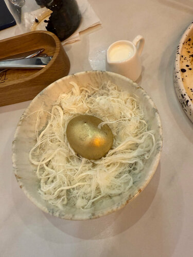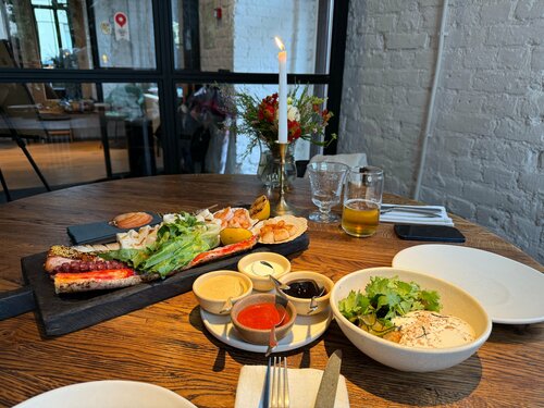 Очень хотела попасть в этот ресторан, но когда попала- разочаровалась. Сам ресторан неплохой- средний с современным минималистичным интерьером. Попали в заведение без проблем, стол не бронировали, хотя был вечер выходного дня и другие рестораны были с полной посадкой, тут посадили без проблем. Кухня- в принципе, вкусная, но никакая. Особенных впечатлений не получили. Стоимость- выше среднего. И поэтому тоже разочаровали блюда, которые попробовали. Мясо было очень жесткое. Лепешки- безвкусные. Есть другие места, где те же самые блюда намного вкуснее, дешевле и остаются в памяти. Персонал- плохо ориентируется в меню, не может проконсультировать по составу блюда. Постоянно забывали приборы принести вместе с блюдом. Советовала бы я данную точку ресторана- нет. Это средний ресторан со средней кухней, персоналом и большой стоимостью. Лучше сходить в другие места.