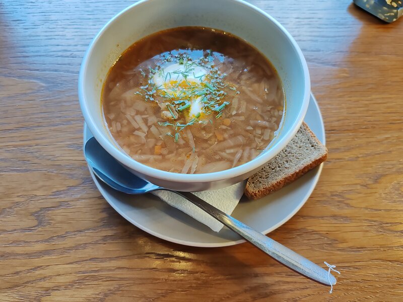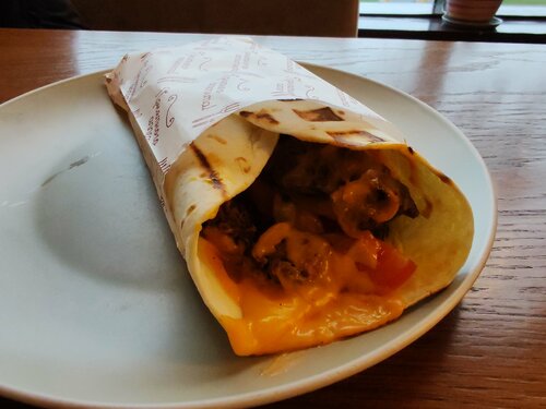 Хорошая кофейня на четвёртом этаже! Борщ это скорее щи. Вкусные, наваристые, но щи. Шаверма разваливается и с капустой. Говядина великолепна. Лаваш поджарен в вафельнице. Вафля-бургер великолепен. Куриная котлета на отлично! Лучшее из заказанного) Кофе обычный. В капучино добавили чуть больше лавандового сиропа, чем следовало. Среди окрестных заведений, наверное, лучшее место.