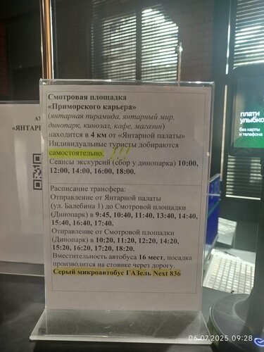 Очень удобно, что есть трансфер на карьер и это входит в стоимость билета. Водитель замечательный. Экскурсовод на карьере Елена очень интересно рассказывала, с душой. Если берёшь билет и в янтарную палату и на карьер, то можно использовать в течении двух дней.