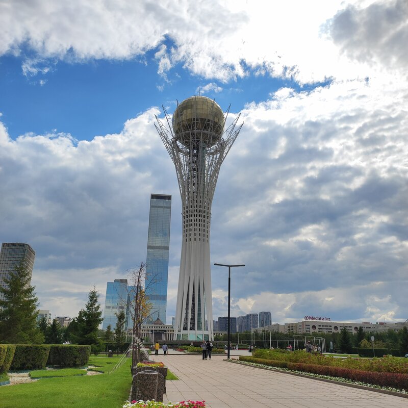 Волшебное место «Байтерек» (...) выражает космогонические представления древних кочевников, по преданиям которых на стыке миров протекает Мировая река. На её берегу возвышается Дерево жизни — Байтерек, корнями удерживающее землю, а кроной подпирающее небо. Корни (...) находятся в подземном мире, (...) ствол — земном, а крона — в небесном. Каждый год в кроне Дерева священная птица Самрук откладывает яйцо — Солнце, которое проглатывает дракон Айдахар, живущий у подножия дерева жизни, что символически означает смену лета и зимы, дня и ночи, борьбу Добра и Зла. «Байтерек» означает молодое, крепкое, растущее дерево, символизирует собой государство, сохранившее свои исторические корни, имеющее прочную опору и устремленность к будущему процветанию.