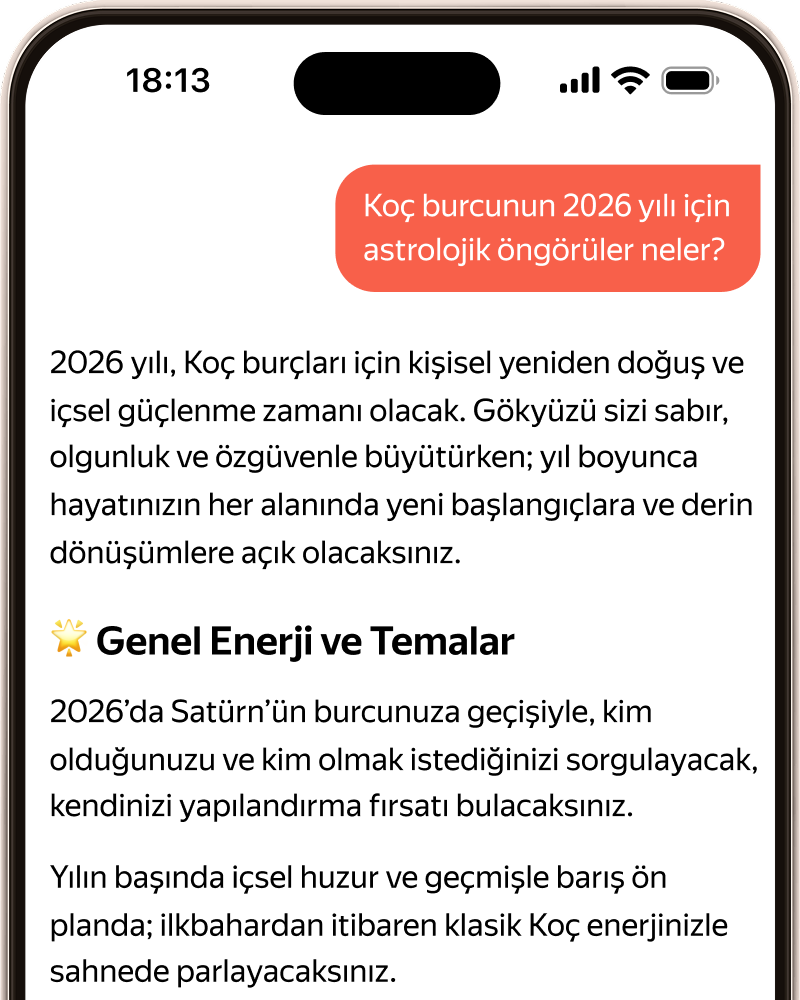 Yandex’in yeni yapay zeka uygulaması internet deneyimini yeniden tanımlıyor. Gelişmiş araçlarla düşüncelerini düzenleyebilir, derslerini ve işlerini kolayca yönetebilir, günlük hayatını daha verimli hale getirebilirsin. İnternette zahmetsizce gez, işlerini hızla tamamla, yeni becerileri kolayca öğren, özgün içerikler oluştur ve tüm bunların keyfini çıkar.