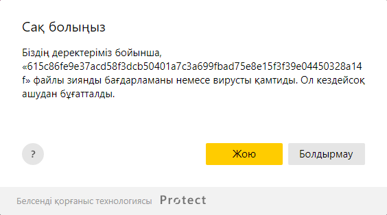 Егер жүктелетін файлда зарарлы БЖ болса, Браузер оны бұғаттайды. Зарарлы файл белгішесімен белгіленеді, ал оны ашу әрекеті кезінде ескертуді көресіз.