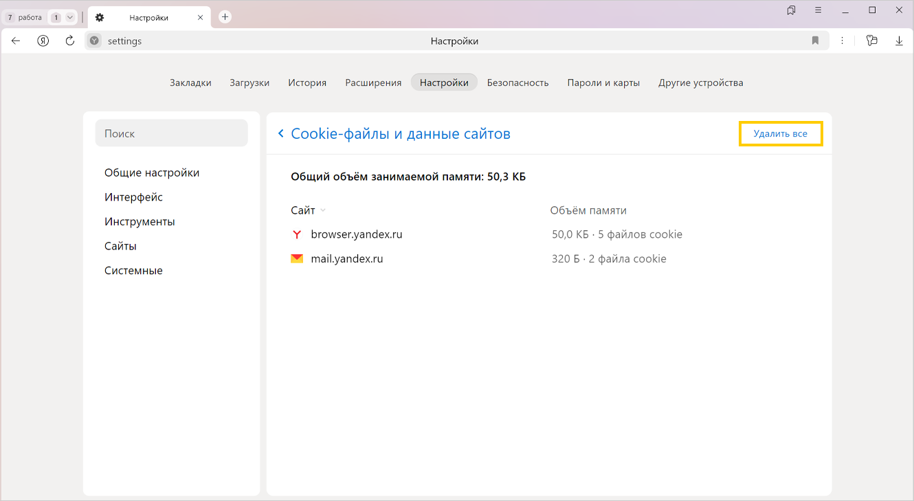 2. В разделе Сookie-файлы нажмите Сookie-файлы и данные сайтов → Удалить все.