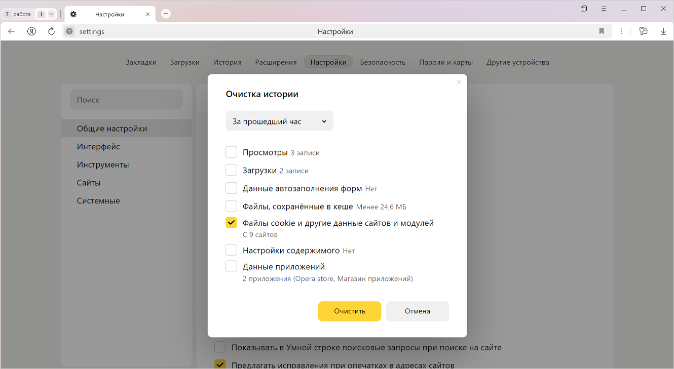 3. Выберите пункт Файлы cookie и другие данные сайтов и модулей (отключите остальные опции, если хотите удалить только cookie).