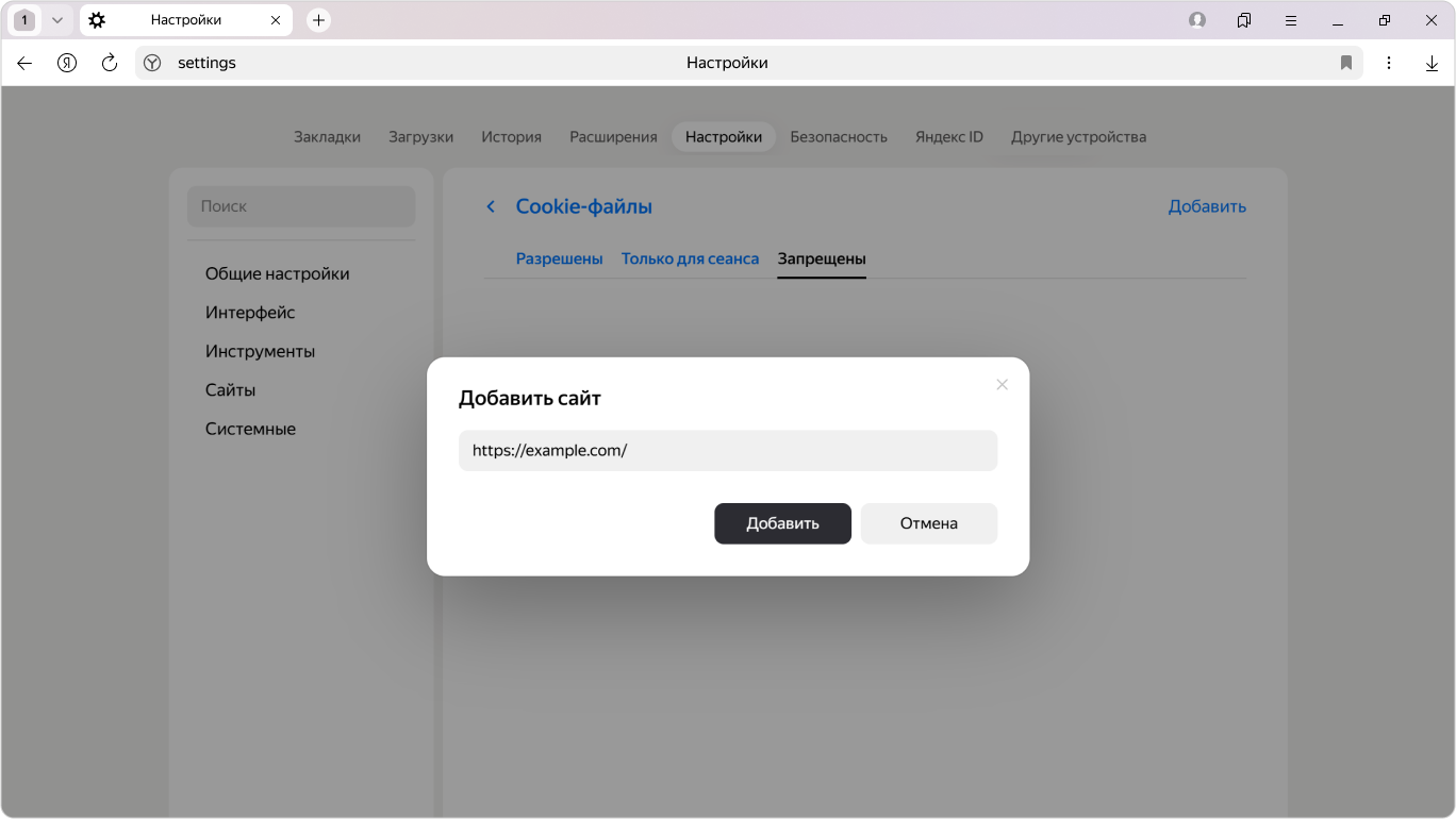 3. В разделе Сookie-файлы включите опцию Запрещены.