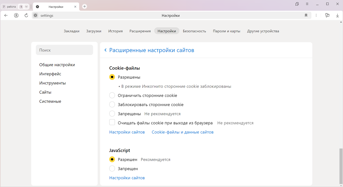 1. Нажмите  → Настройки → Сайты → Расширенные настройки сайтов.