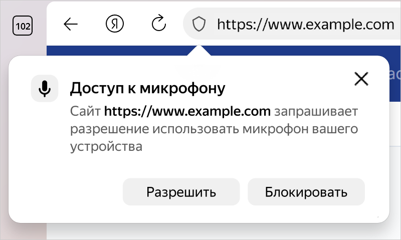 По умолчанию, когда сайт пытается получить доступ к микрофону, бета-версия Яндекс Браузера запрашивает у вас разрешение.