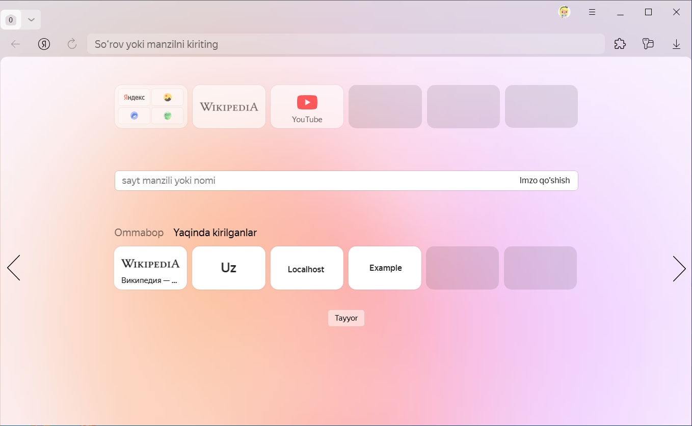 Tabloga qo‘shmoqchi bo‘lgan saytni ko‘rsating. Saytni Ommabop yoki Yaqinda kirilganlar ro‘yxatidan tanlashingiz yoki uning manzilini oddiy usulda kiritishingiz mumkin.