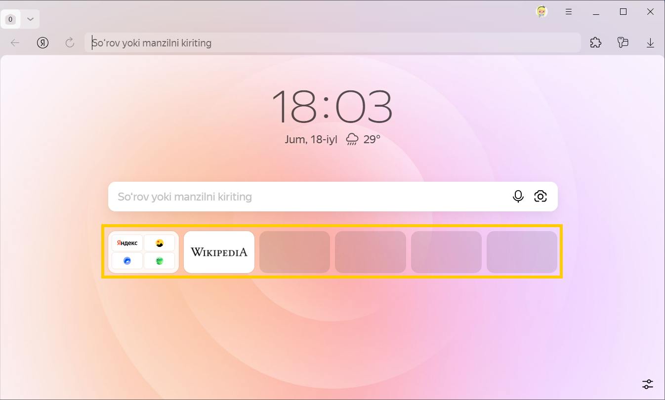 Yangi varaqni ochilganda yoki Aqlli satr ustiga bosilganda, Tablo paydo boʻladi. Bu eng koʻp kiriladigan saytlarning piktogramma – vidjetidir. Tabloga standart holatda ayrim Yandex xizmatlarining vidjetlari o‘rnatilgan.