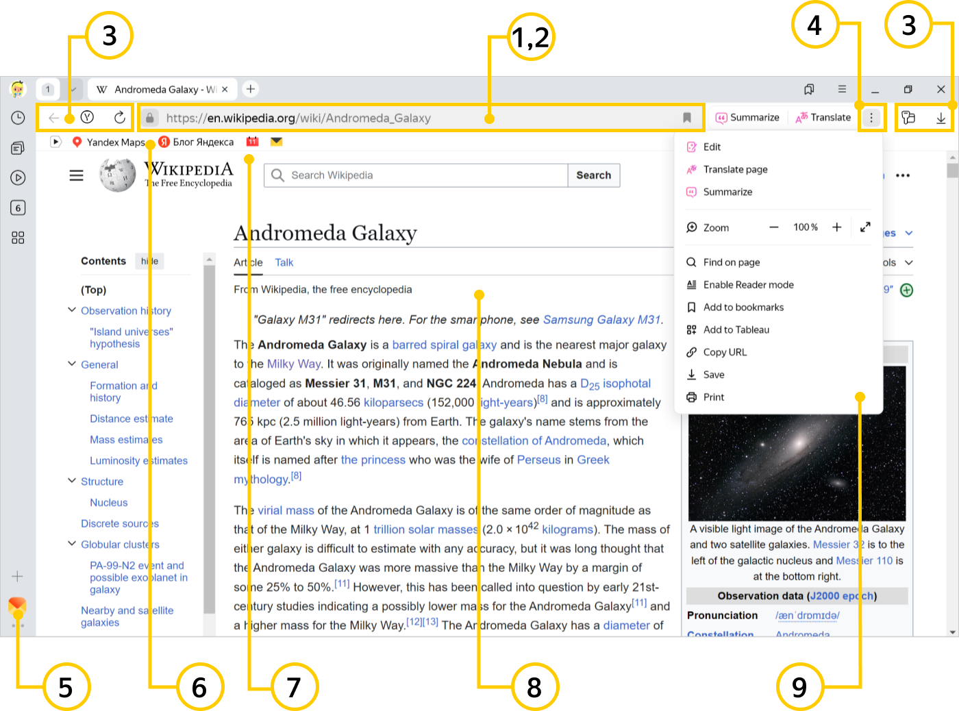 On the second level, cycle through the Back, Go to Yandex , Refresh page, Page menu, Password manager , Downloads, and other buttons.