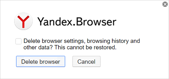 Your information and settings will only be deleted from your local computer. If you synced your devices, most of your profile data will be saved on the Yandex server. After you reinstall Yandex Browser and sync it with the server, your personal data and Yandex Browser settings will be restored. If you don't want your data to be restored, delete it from the server.