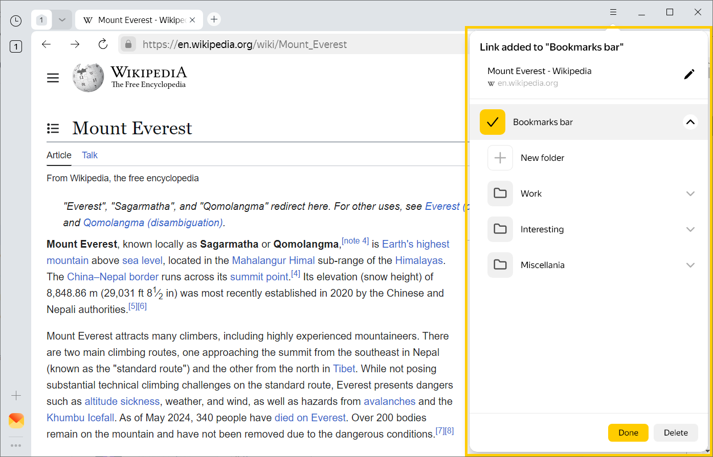 to edit the bookmark name. - By default, the link is saved to the same folder as the previous one. If you want to save it to a different folder, click New folder or select a folder from the list below.