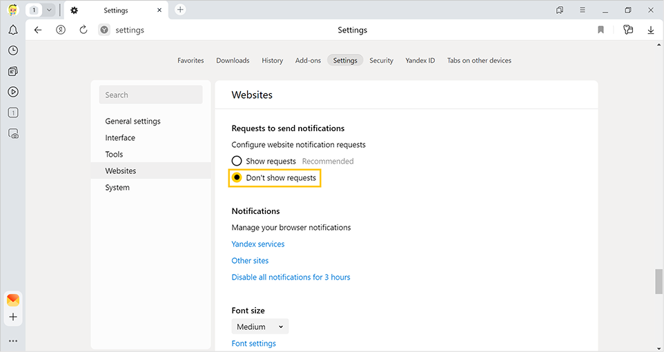 Websites can send notifications about news, comments, updates, and other events. Sites usually request permission to send notifications, but sometimes they can do this without permission. In Yandex Browser, you can allow or block notifications from a specific website, or disable notifications from all sites.