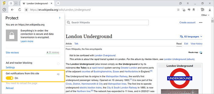 In the Protect panel that opens, enable or disable the Get notifications from this site option.
