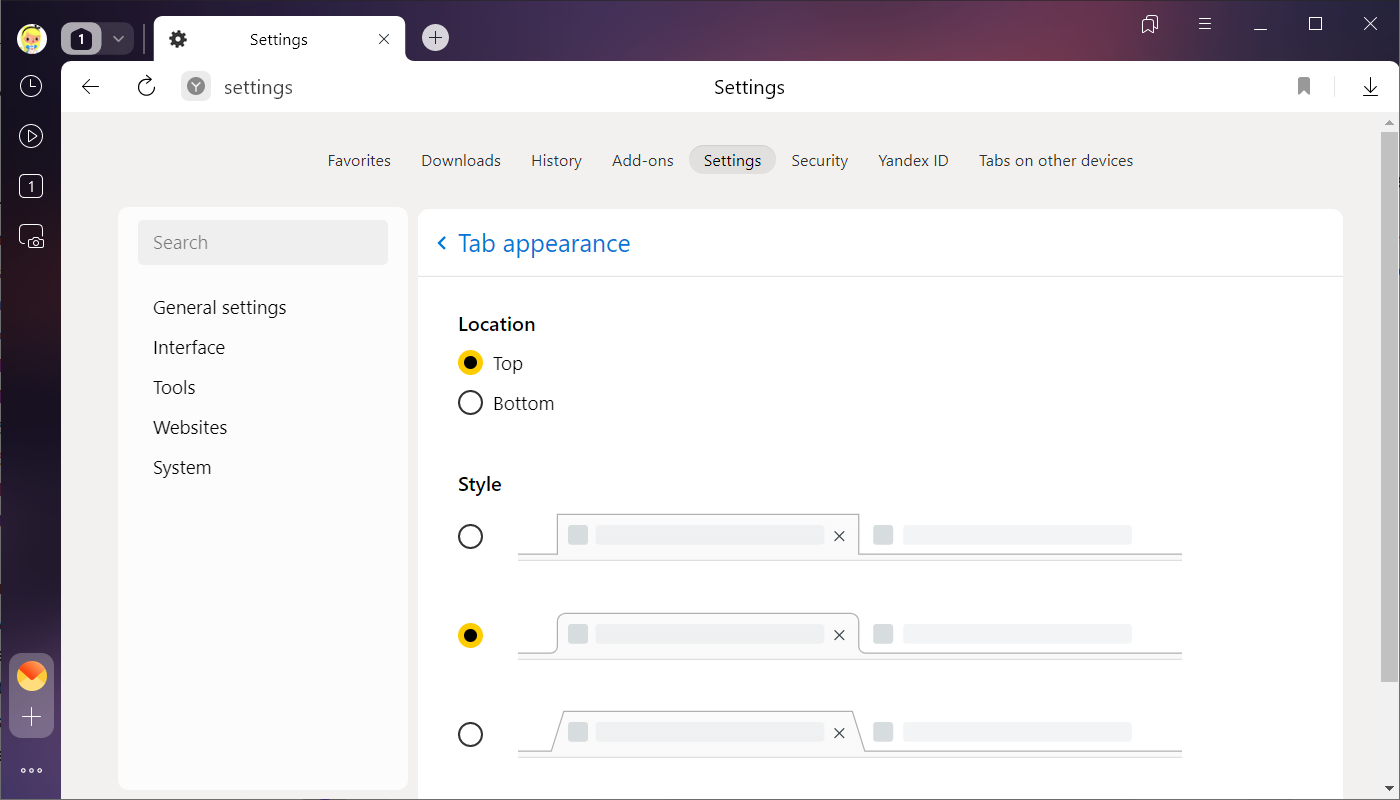 If you accidentally click the same link in an external app multiple times, several identical tabs will open in Yandex Yandex Browser. To prevent this from happening, go to  → Settings → Interface and enable the option Do not duplicate tabs when opening from external apps.