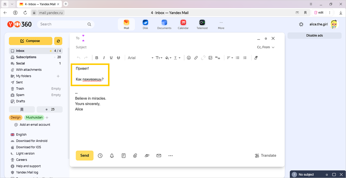 When you enter text, Yandex Browser underlines unfamiliar words. If you are sure the underlined word is spelled correctly, right-click it and select Add to dictionary.
