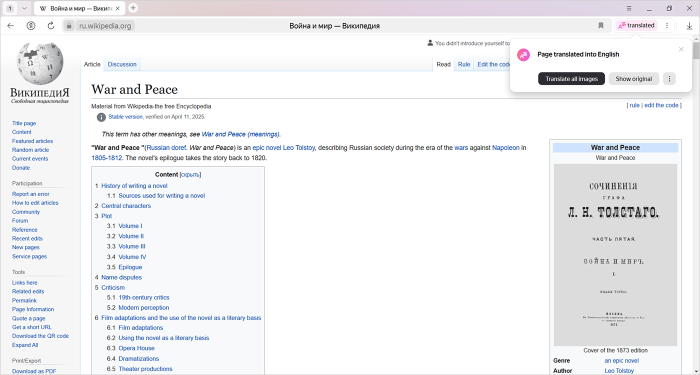 Yandex Browser will prompt you to translate the page if its language is different from your interface language. You can access Yandex Translate or translate specific words, images or videos using the context menu.