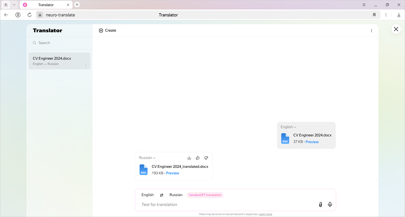 Yandex Browser can translate DOC, DOCX, and PDF documents, XLS and XLSX spreadsheets, and PPT and PPTX presentations.