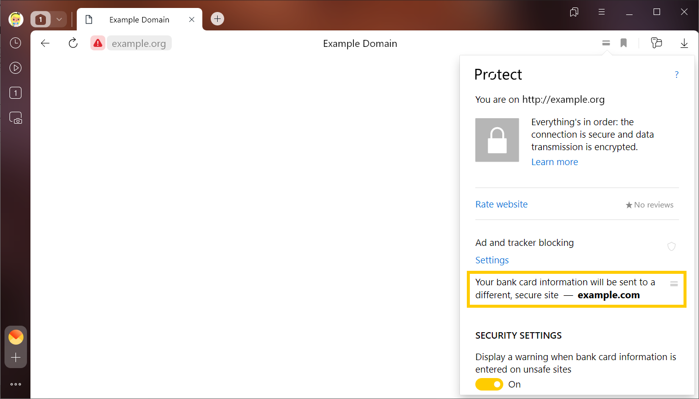 When you enter your bank card number, there are two types of warnings that Yandex Browser may display: