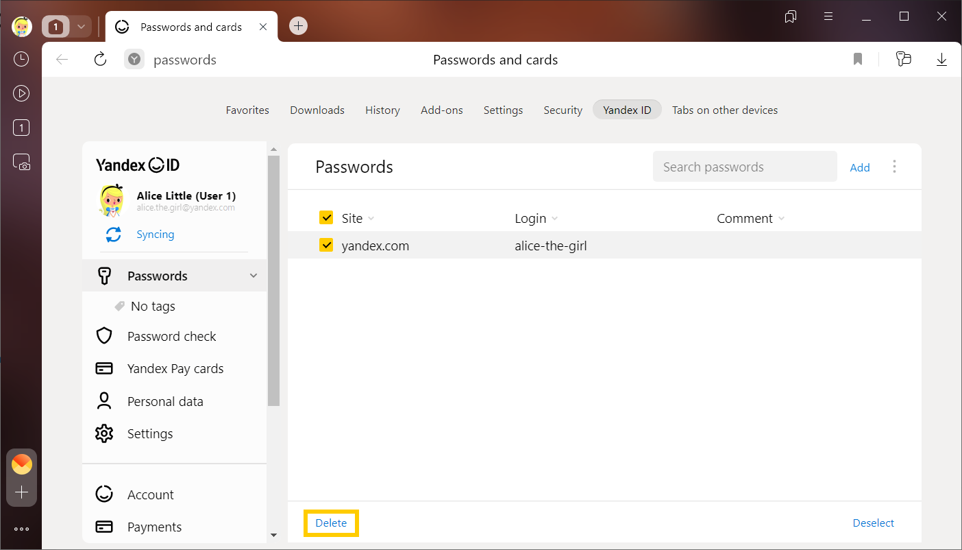 If you deleted passwords on one of your devices, you can try to restore them using another one. You can do this if your other device hasn't received the information about deleting passwords from the server yet. For example, if it doesn't sync, was turned off, or you deleted the passwords only a short while ago:
