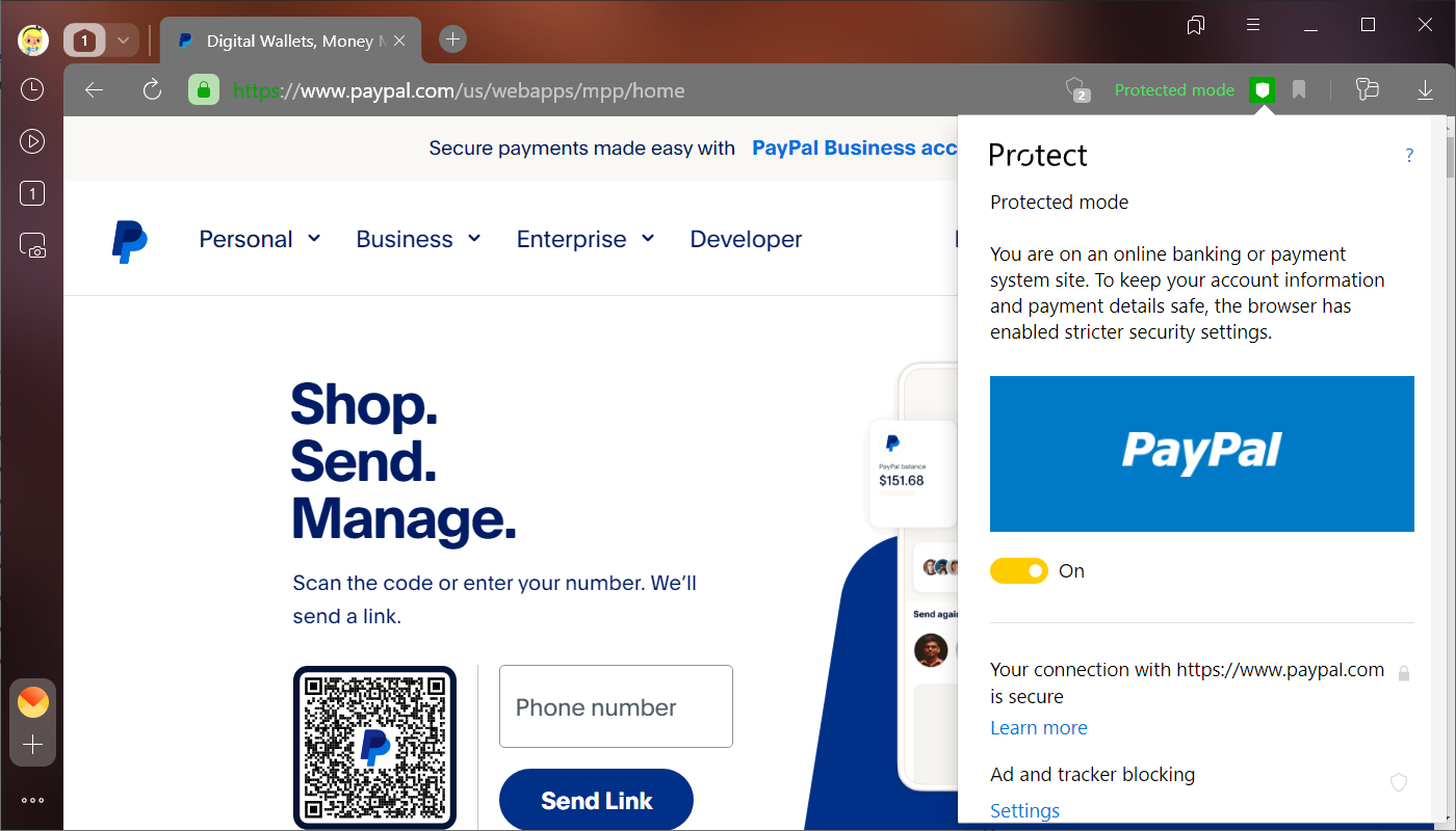 If protected mode is not enabled, there are most likely problems with the site certificate. It’s better not to make payments on this page. We recommend that you open the Protect panel, read the information about using the certificate and assess the risk of theft of your payment information.