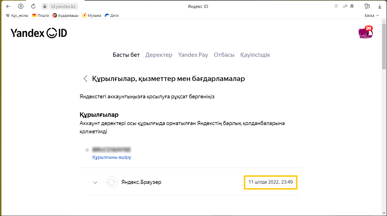 5. Күні мен Соңғы кірген уақыты өрісіндегі уақытты тексеріңіз. Деректерді жою қолжетімсіз құрылғыдағы Браузермен синхрондалған сәттен бастап мәндері жаңартылады. Синхрондау интернет жылдамдығы мен мәліметтер санына байланысты 40 минутқа дейінгі уақытты алуы мүмкін.
